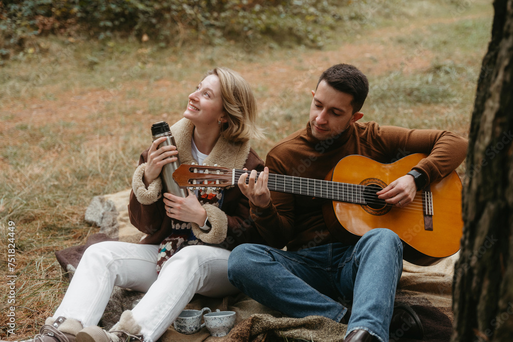 Adult couple sitting on blanket in autumn park, man playing guitar for happy woman