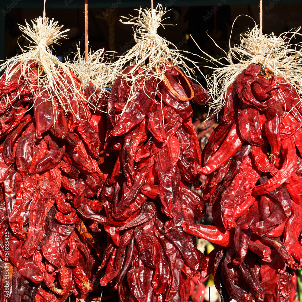 Chile Ristras of red chile peppers hanging in bunches in bright sun. Ristras, often used for decoration, are said to bring good health and good luck.