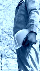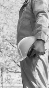 桜の花とヘルメットを持つ作業服の男性