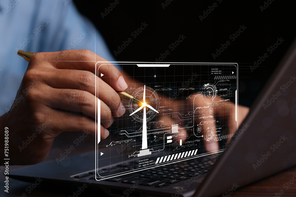 Businessman using laptop with Alternative energy for the future concept,Wind turbines change wind energy into electrical energy.