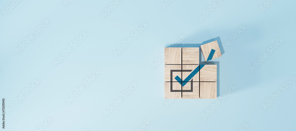 Quality and ISO symbol. Placing wooden cube with checkmark icon. Goals achievement and business success. Task completion. Ethical corporate. Do the right thing.