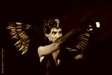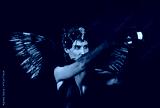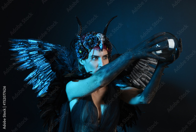 Close up portrait of female model wearing gothic horned headdress, halloween black dress, fantasy angel feather wings. Holding mystical crystal ball. dark studio background cinematic shadow silhouette