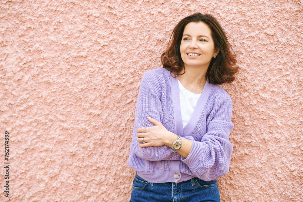 Outdoor portrait of pretty 40 - 45 year old woman leaning on pink wall, wearing purple cardigan, spring mood and colours