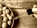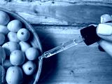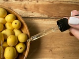 Marula fruit cosmetic oil in a dropper with marula fruit in soft focus