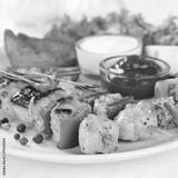 Hühnchen Fleischspieß Gericht mit Kartoffeln und Gemüse auf T