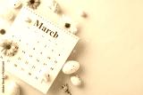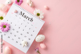 Delightful Easter arrangement. Top view snapshot of eggs, March calendar, ceramic hares, chrysanthemums, and confetti on a gentle pink background, with space for holiday greetings or advertising