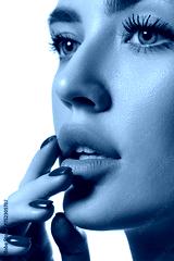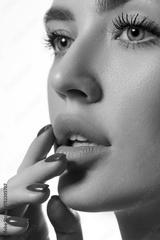 Cropped close-up image of beautiful female face with plump lips, nude lipsticks makeup isolated against white background. Lip augmentation. Concept of natural beauty, cosmetology, cosmetics, skin care