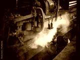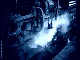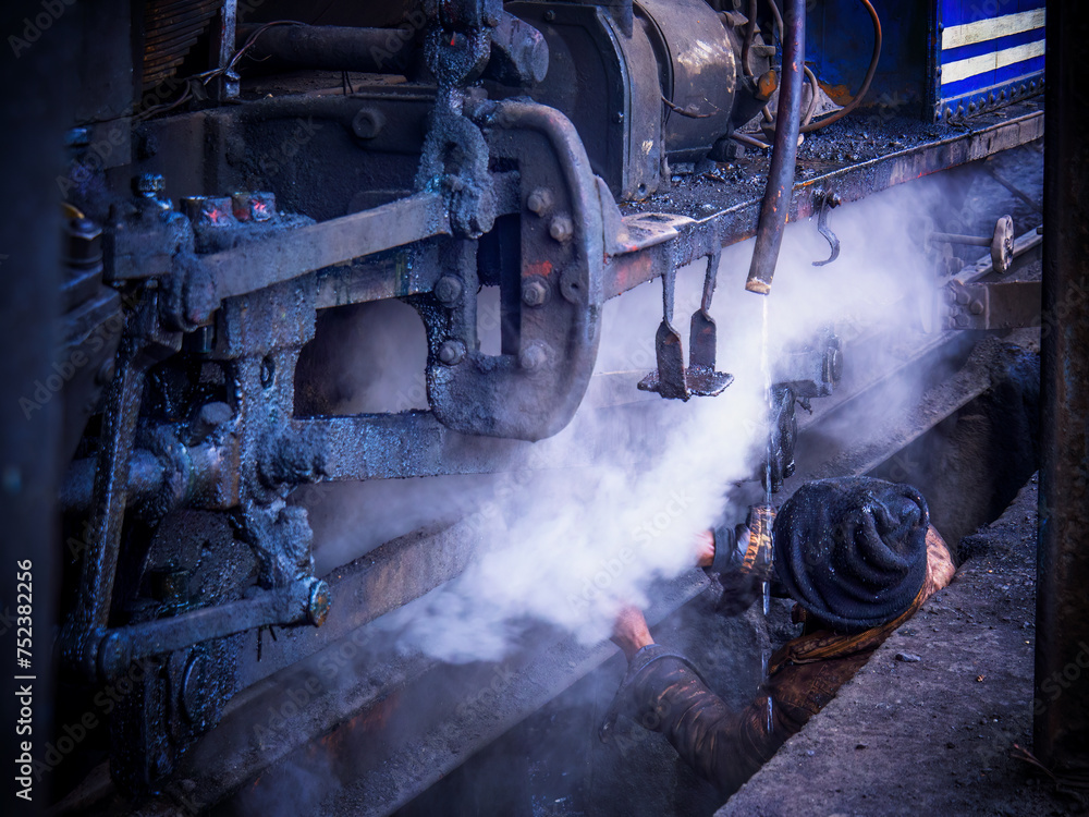 A railway mechanic working under a steam locomotive
