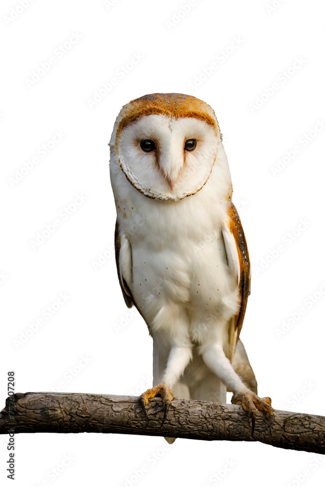 Owl at sunset. Barn owl, Tyto alba, perched on branch in last sun rays. Beautiful white owl with heart-shaped face. Colorful autumn in wild nature. Wildlife. Hunting bird on forest meadow.