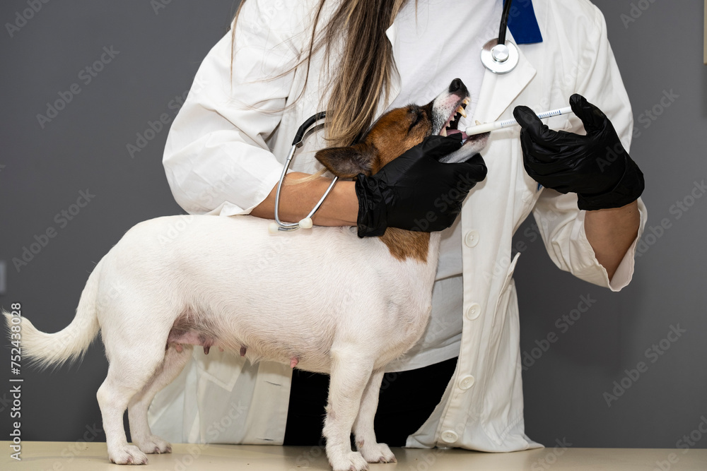 A female veterinarian gives medicine to a dog that is standing on the table.
