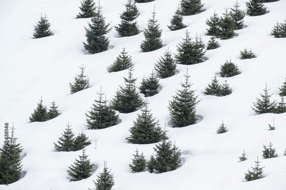 Young spruce trees planted on the mountainside. Original natural texture, pattern.