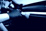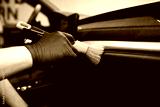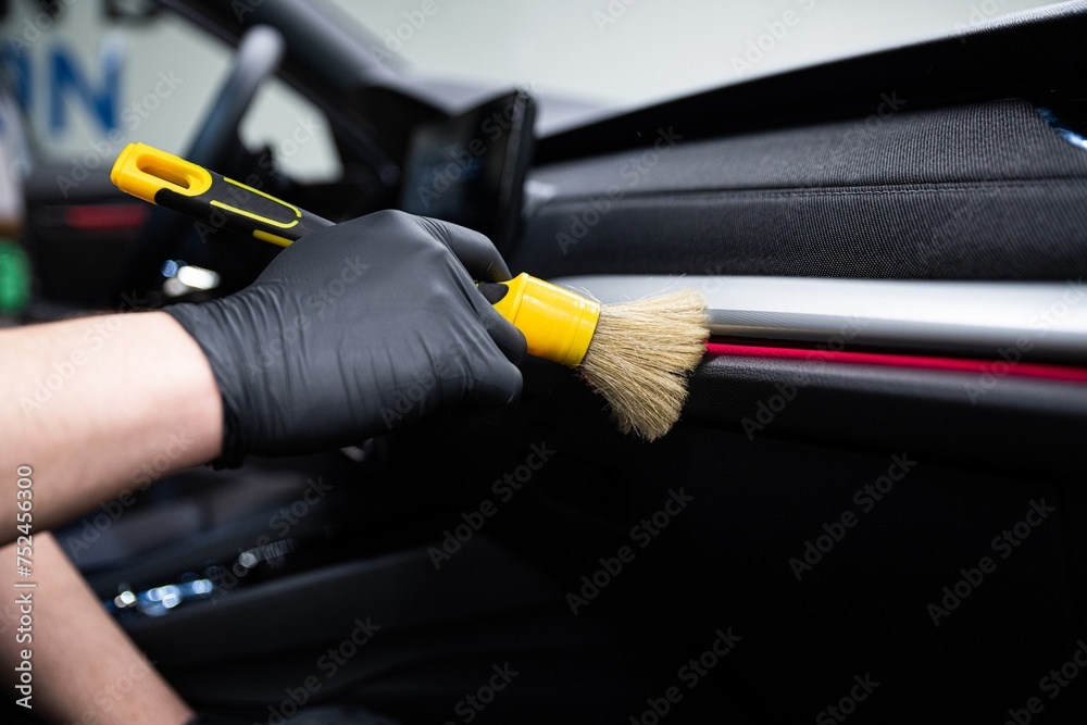 Car wash or car detailing studio worker carefully cleaning car interior with special brush