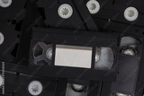 Videotape with blank tags. Pile of VHS video cassettes. Vintage media. Isolate on a white back
