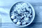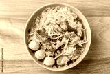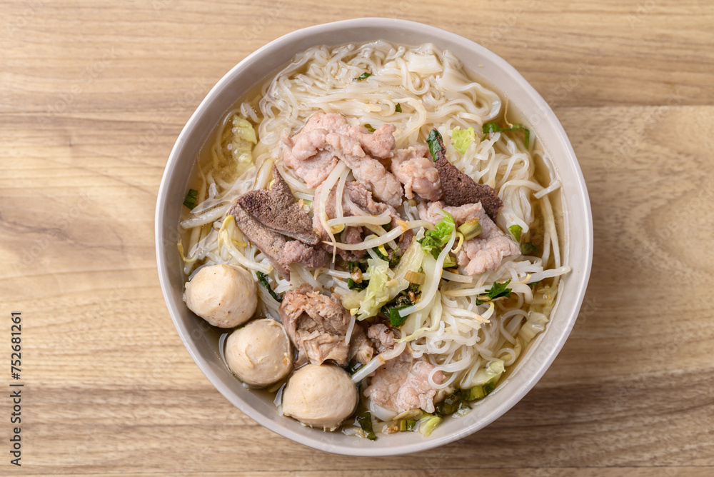 Rice noodles soup with pork in bowl on wooden background, Thai noodles soup, Top view