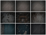 Set of dark background textures. Collection of textures with peeling paint, cracks, rust, scratches, stains, noise and grain. Weathered rough surfaces of old walls. Bundle of backgrounds for design.