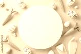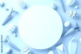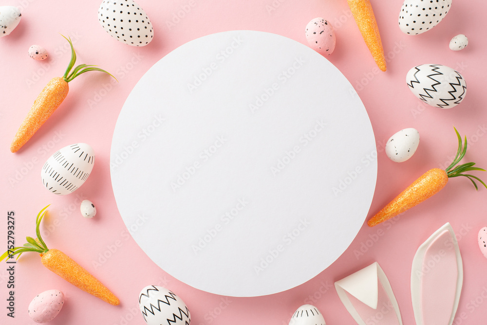 Easter art concept: Top-view photo of minimalist painted eggs, sweet bunny ears, and carrots as Easter Bunny favors on a blush pink background, leaving a round blank space for wording