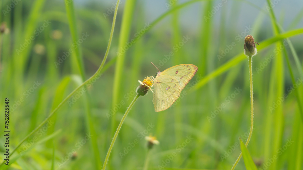 A butterfly gracefully perches on a blade of grass in a serene meadow. The vibrant colors of its wings contrast beautifully with the greenery of the grass.