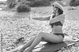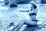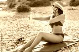 Middle aged woman in red bikini puts sunscreen cream on her body on the beach.