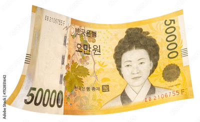 50000 South Korean won banknotes falling in the air isolated on white, Flying South Korean won banknotes isolated on white background With clipping path.