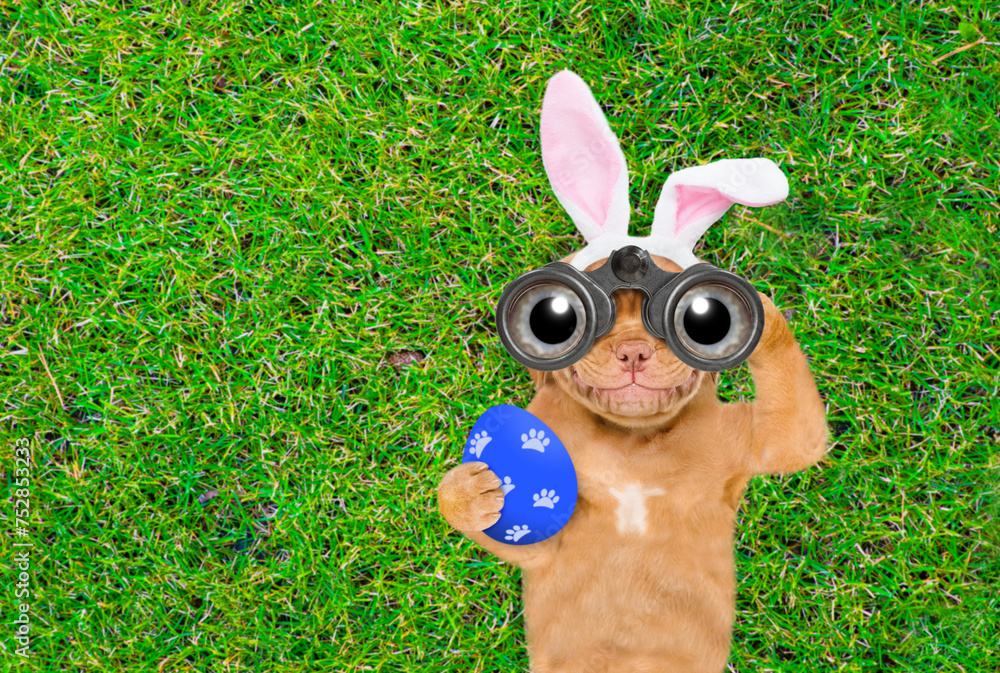 Happy puppy wearing easter rabbits ears holds painted easter egg and looks through binoculars on green grass. Top down view