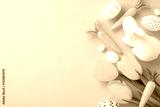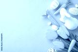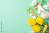 Easter theme setup: Top view of simply dyed eggs, charming rabbit sculpture, carrots for the Easter Hare, and tulips against a turquoise scene with space for text or ads
