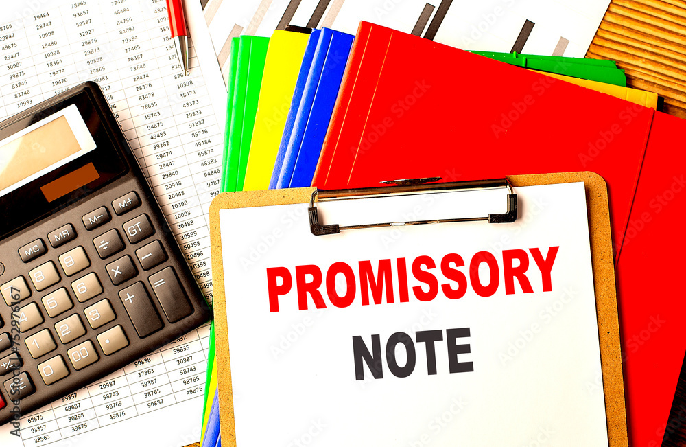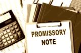 PROMISSORY NOTE text written on paper clipboard with chart and calculator