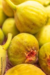 Selective focus of organically grown figs in a wicker basket, close up view