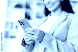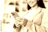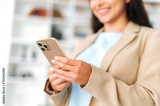 Using gadgets. Close-up of female hands, holding smart phone, texting in social media with friends or clients, making online order or goods delivery, typing text, browsing information in internet
