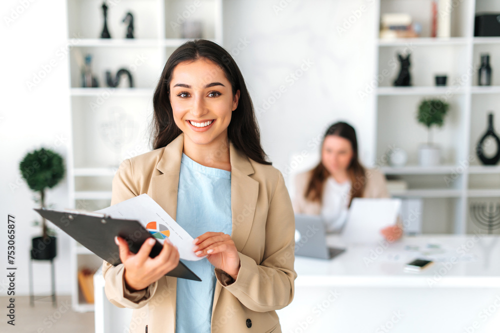 Confident pretty indian or arabian business, company executive, financial manager, stand in a modern office, holding documents, looking and smiles at camera, a colleague is sitting in the background