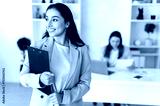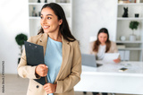 Confident pretty indian or arabian business, company executive, financial manager, stand in a modern office, holding documents, looking away and smiling, a colleague is sitting in the background