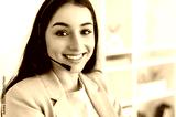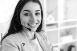 Close-up of arabian or indian pretty woman, call center operator with headset, working on support hotline in a modern office with a laptop, looking at camera, smiles friendly. Customer support service