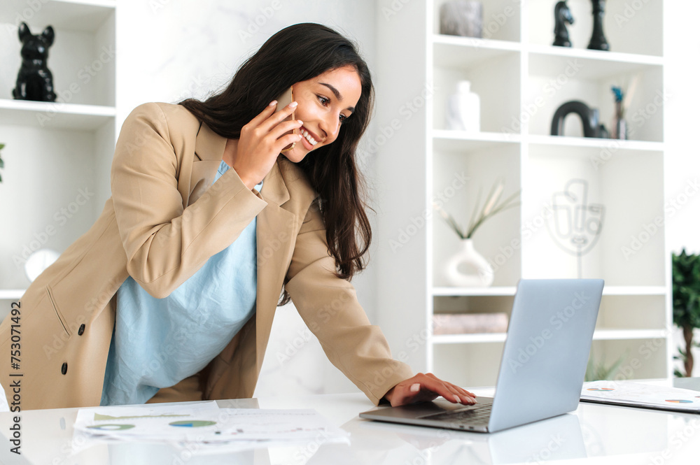 Smartphone conversation. Indian or arabian business lady, corporate manager, ceo, stand near a table in the office, talking by smartphone, having negotiation with partner or client, uses laptop, smile