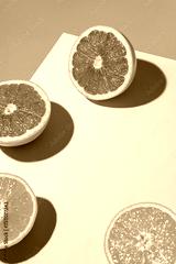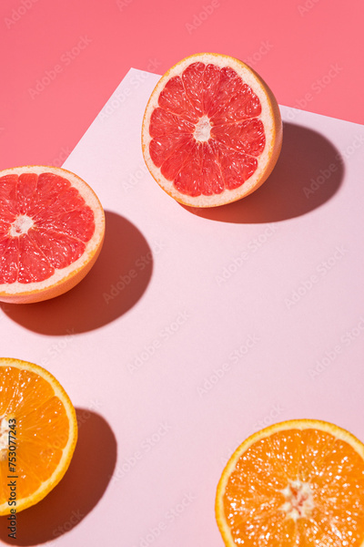 Creative fruit composition on pink background with hard shadows. Summer minimal concept.