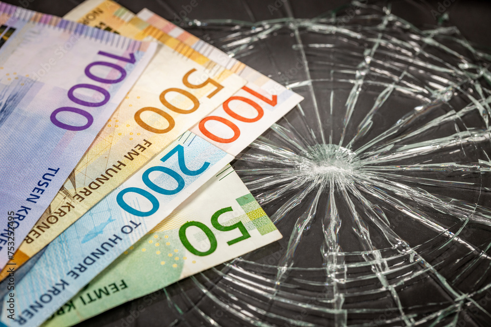 Norwegian money on broken glass, concept of weakness of Norwegian krone