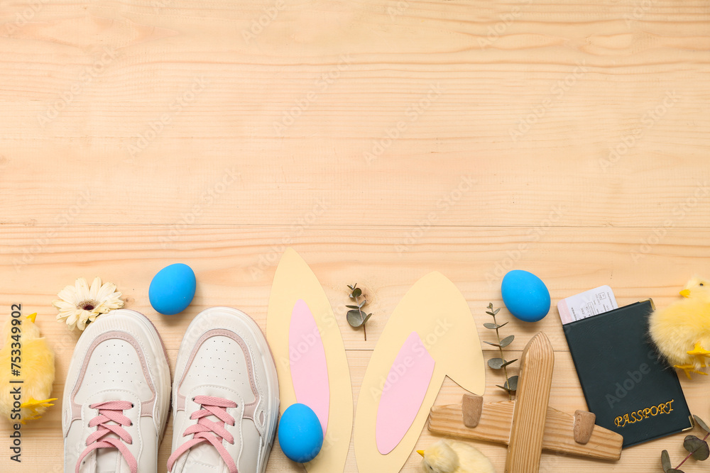 Shoes with toy plane, passport and Easter decor on light wooden background. Holiday travel composition
