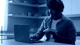 Indian man in headset look app pc browsing typing laptop write ideas questions notes review research sit at home kitchen. Arabian guy learn language improve knowledge self-education distant e-learning