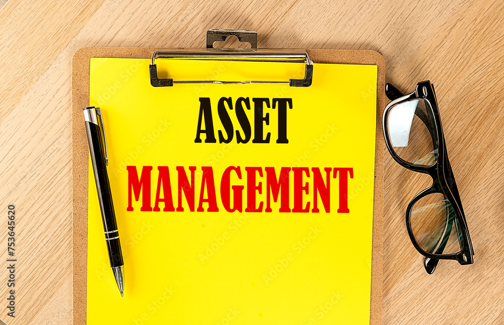 ASSET MANAGEMENT text on a yellow paper on wooden background