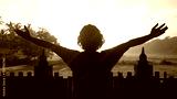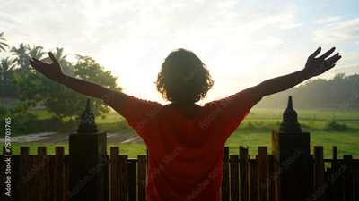 Woman standing alone with raised hands from behind against the warm light of sunrise sky over the green field. Grateful for life and new day concept. Surrender to God.