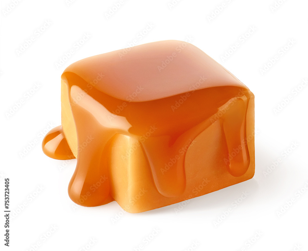 One sweet caramel candy cube topped with caramel sauce on white background