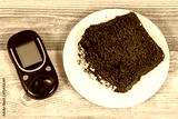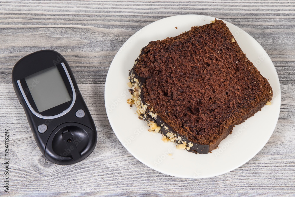 Glucometer for measuring sugar level and sweet chocolate cake. Nutrition during diabetes