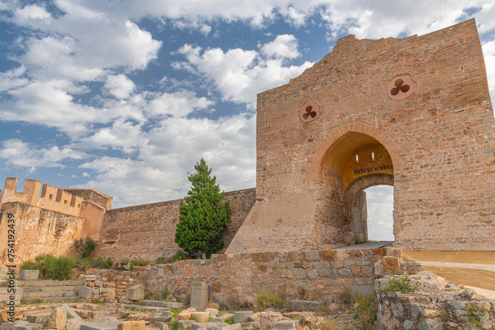 Sagunt, Valencia - Spain - View of the castle in Sagunt, showcasing thick walls, a large gate, partially ruined buildings and foundations