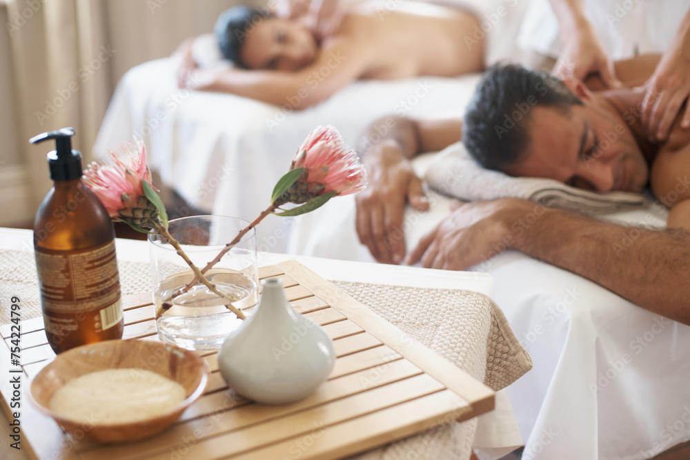 Hotel, flowers and couple in spa to relax on bed or break with luxury pamper treatment tools on table. Protea, facial oil or woman with man at resort or salon for natural healing benefits or massage