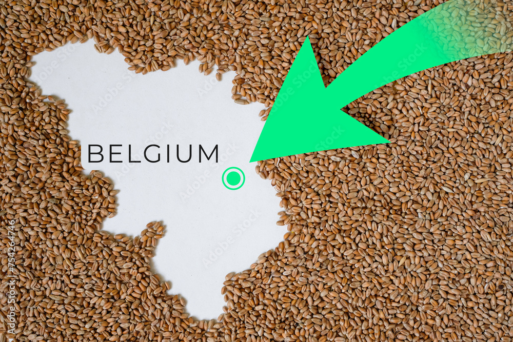 Map of Belgium filled with wheat grain. Direction green arrow. Space for text.