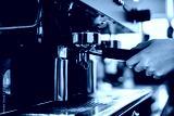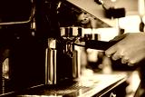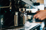 At restaurant or pub coffee machine brews fresh tasty coffee. Step by step guide to professional coffee making process. Close up of machine hand holding handle pouring espresso.