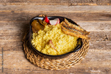 Dish of migas with its accompaniment, roasted peppers, fried anchovies and radishes, on a rustic table.