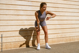 Young fit woman looking at smartwatch and counting calories burned. Healthy life concept