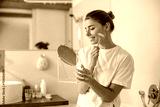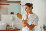 Pretty woman massaging face with jade roller and looking at round cosmetic mirror in bathroom