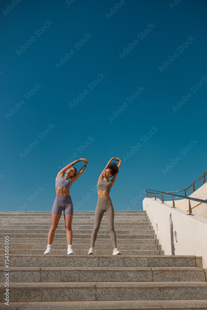 Sporty women does warm-up exercises in morning before running training outside. Healthy fitness