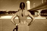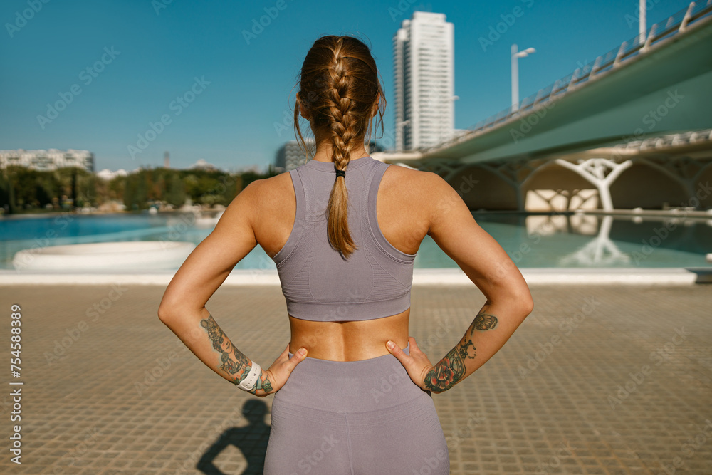 Back view of female athlete in sportswear have a rest after morning jogging outside