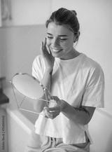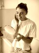 Smiling beautiful lady looking at her face in a small round mirror doing routine skincare procedures